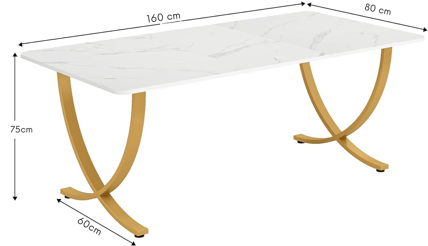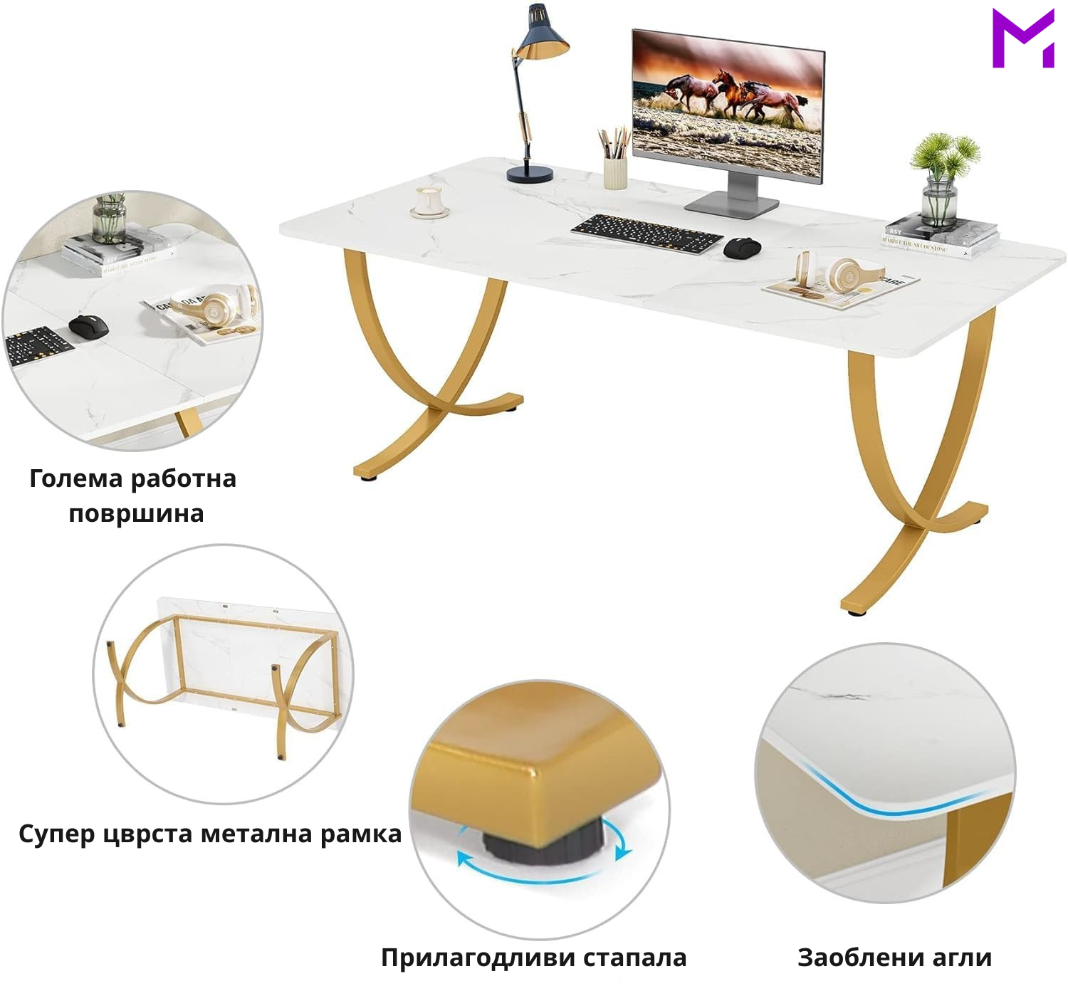 Со бело‑златна комбинација и модерен изглед, оваа работна маса се вклопува во секој ентериер. Може да се користи како трпезариска маса или како канцелариска маса.
