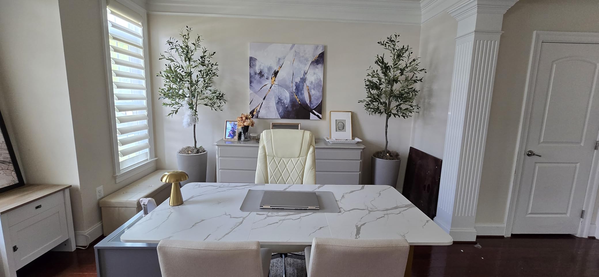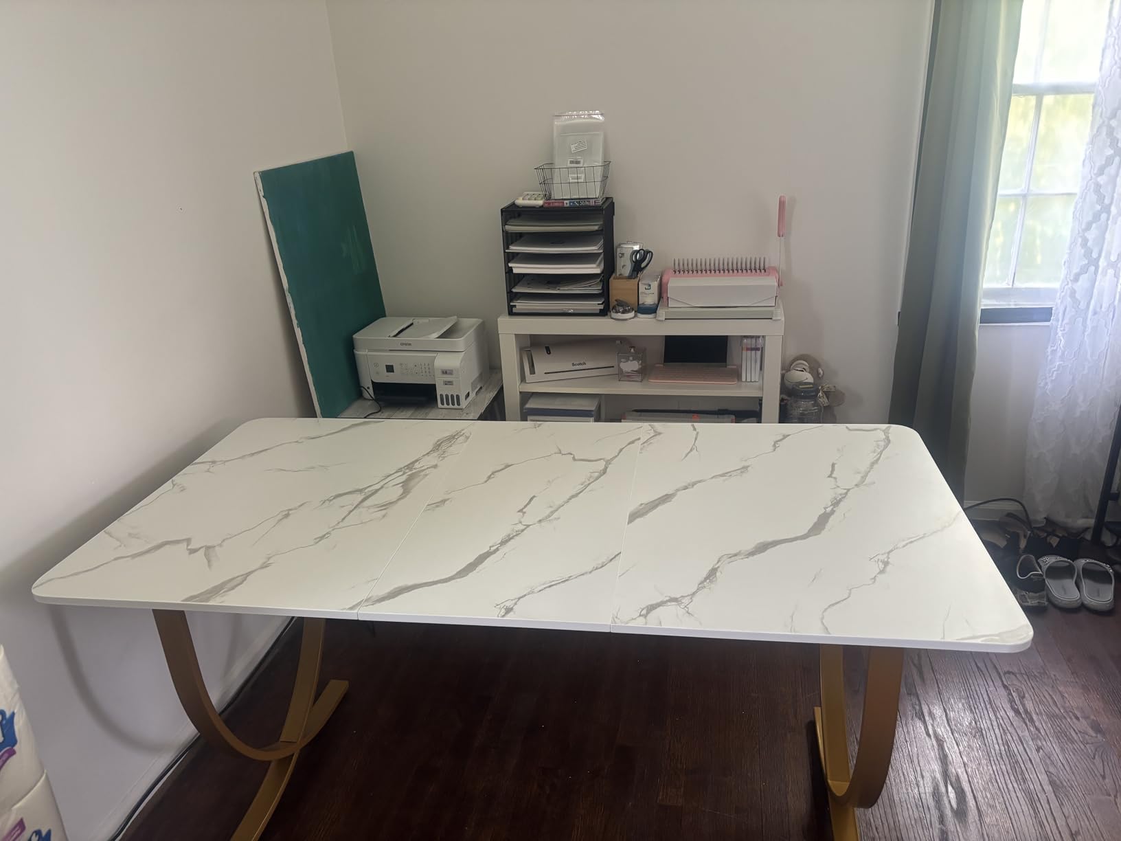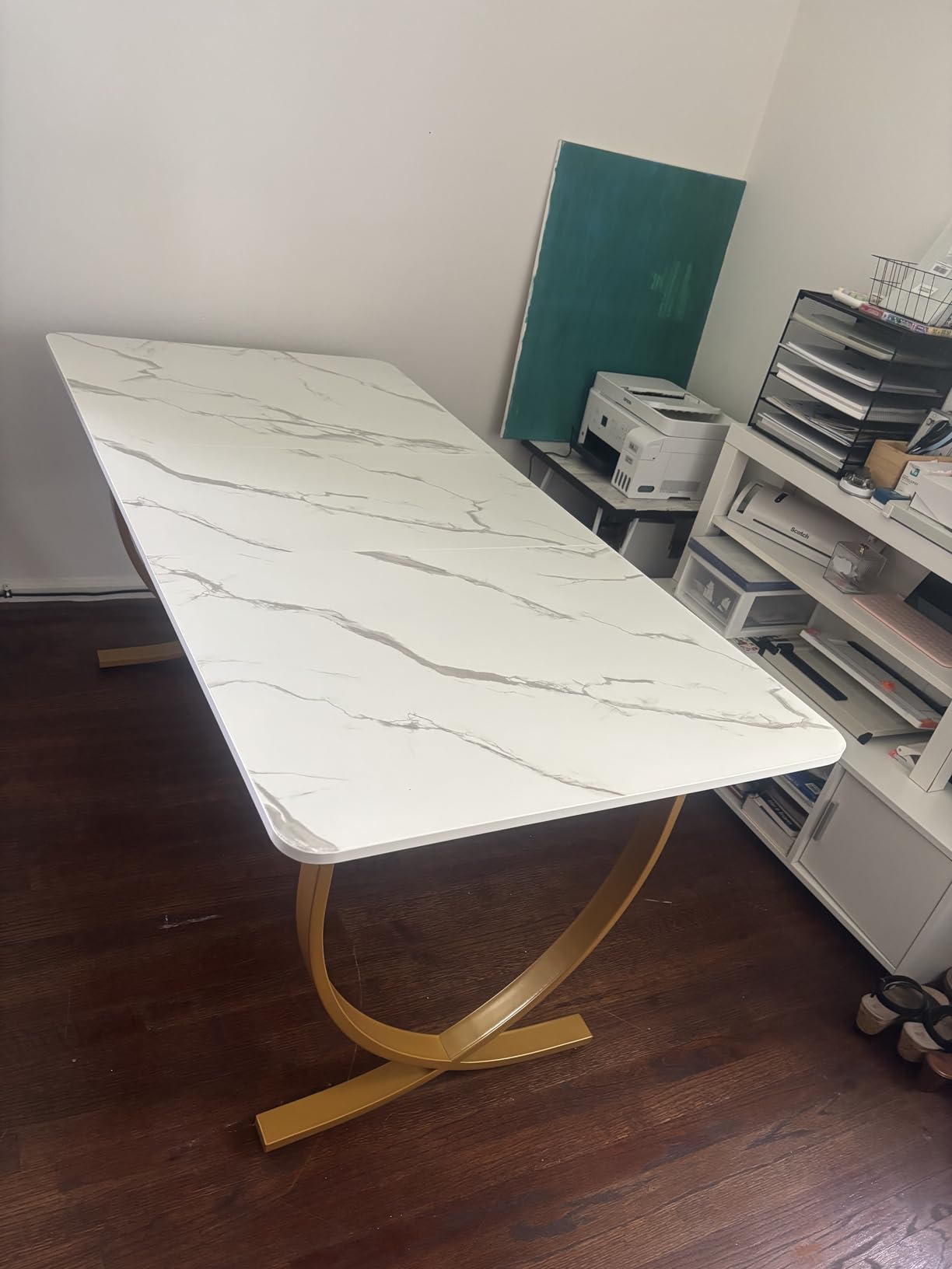 Прекрасна и одлична вредност за парите. Ја користам оваа маса во мојата домашна канцеларија. Доволно е пространа за да собере 2 столчиња на долгата страна од масата, при што секој стол е широк 18,5 инчи. Ова е совршено кога цртам со моите деца или за заедничко пишување домашни задачи. Мојата единствена забелешка (а е мала) е што површината на масата не е усогласена, или барем 3-те парчиња од мермерниот дизајн не се спојуваат за да изгледаат како едно кохезивно парче мермер. Наместо тоа, шарата изгледа раскршена. Сепак, тоа е мала работа што не ја намалува издржливоста на површината. Многу сум задоволна од оваа набавка!
