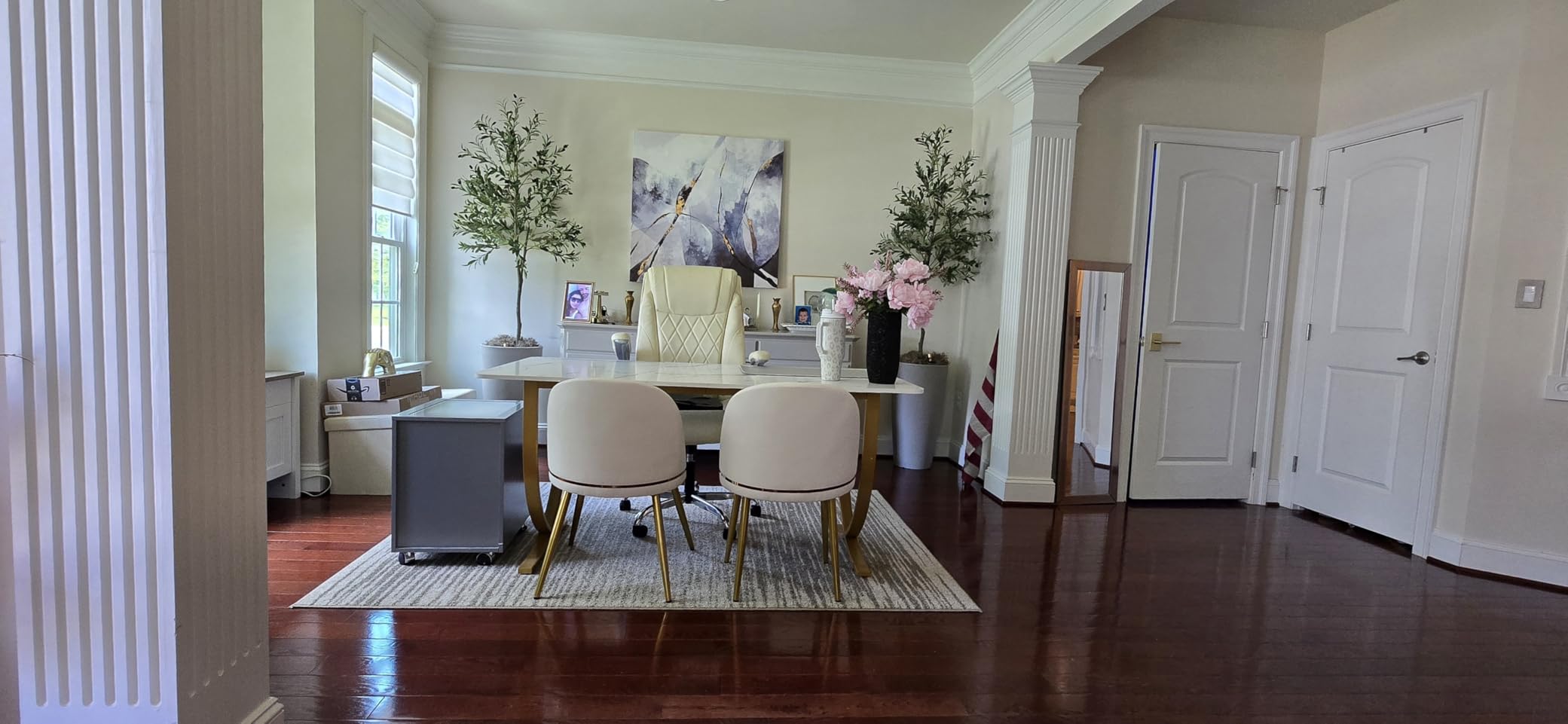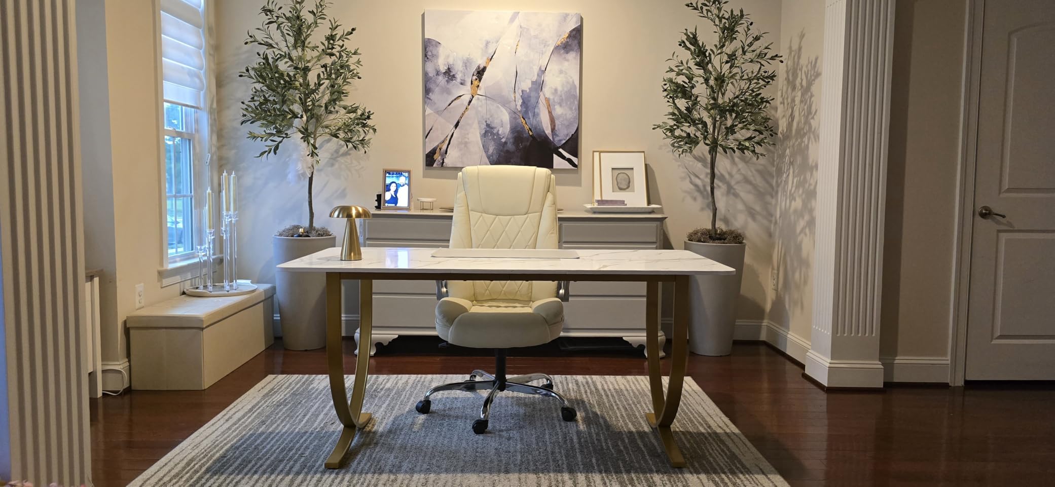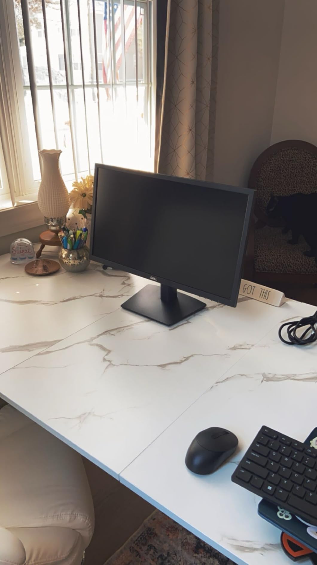 Прекрасна и одлична вредност за парите. Ја користам оваа маса во мојата домашна канцеларија. Доволно е пространа за да собере 2 столчиња на долгата страна од масата, при што секој стол е широк 18,5 инчи. Ова е совршено кога цртам со моите деца или за заедничко пишување домашни задачи. Мојата единствена забелешка (а е мала) е што површината на масата не е усогласена, или барем 3-те парчиња од мермерниот дизајн не се спојуваат за да изгледаат како едно кохезивно парче мермер. Наместо тоа, шарата изгледа раскршена. Сепак, тоа е мала работа што не ја намалува издржливоста на површината. Многу сум задоволна од оваа набавка!