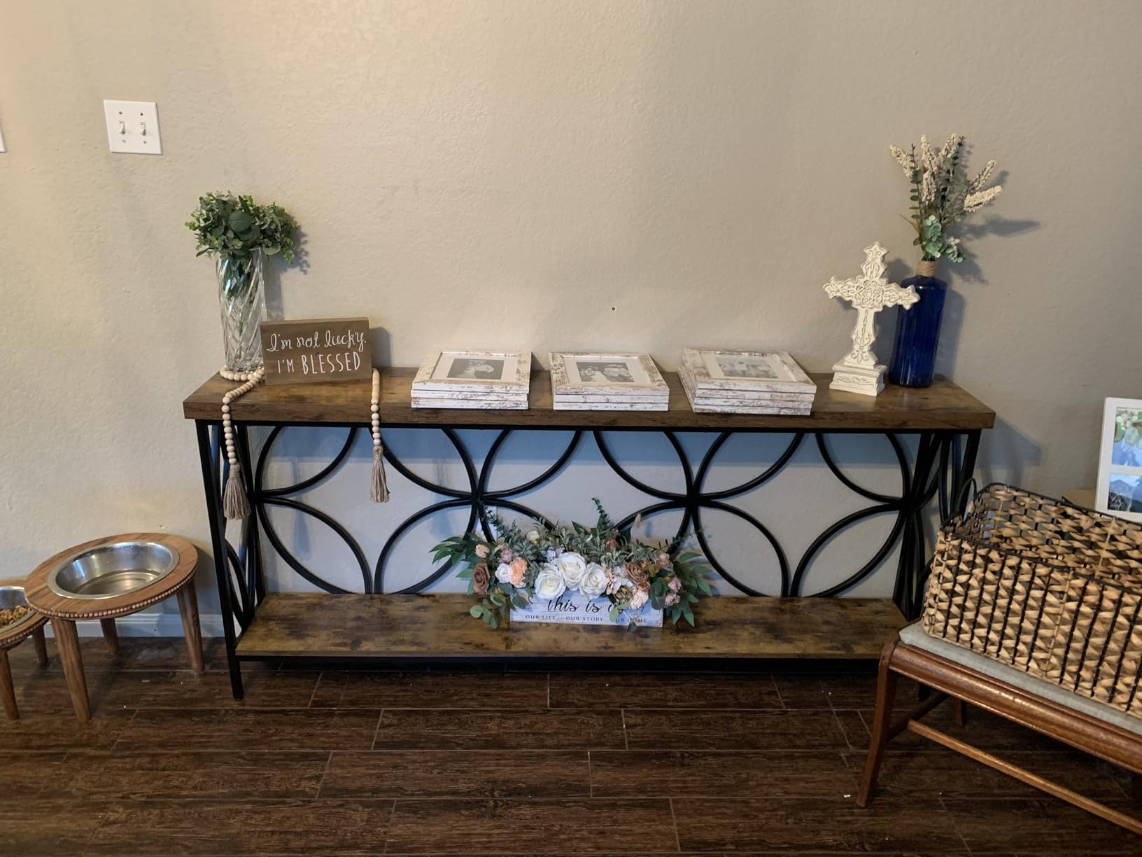 Внесете индустриски шарм и безвременска елеганција во вашиот дом со оваа конзолна маса зад софа, која совршено ги комбинира винтиџ дрвената текстура и црните метални детали.