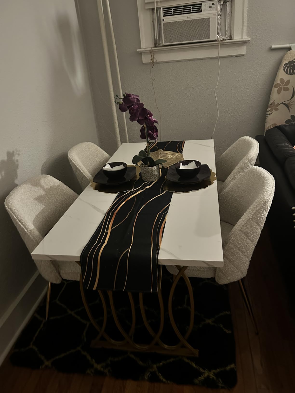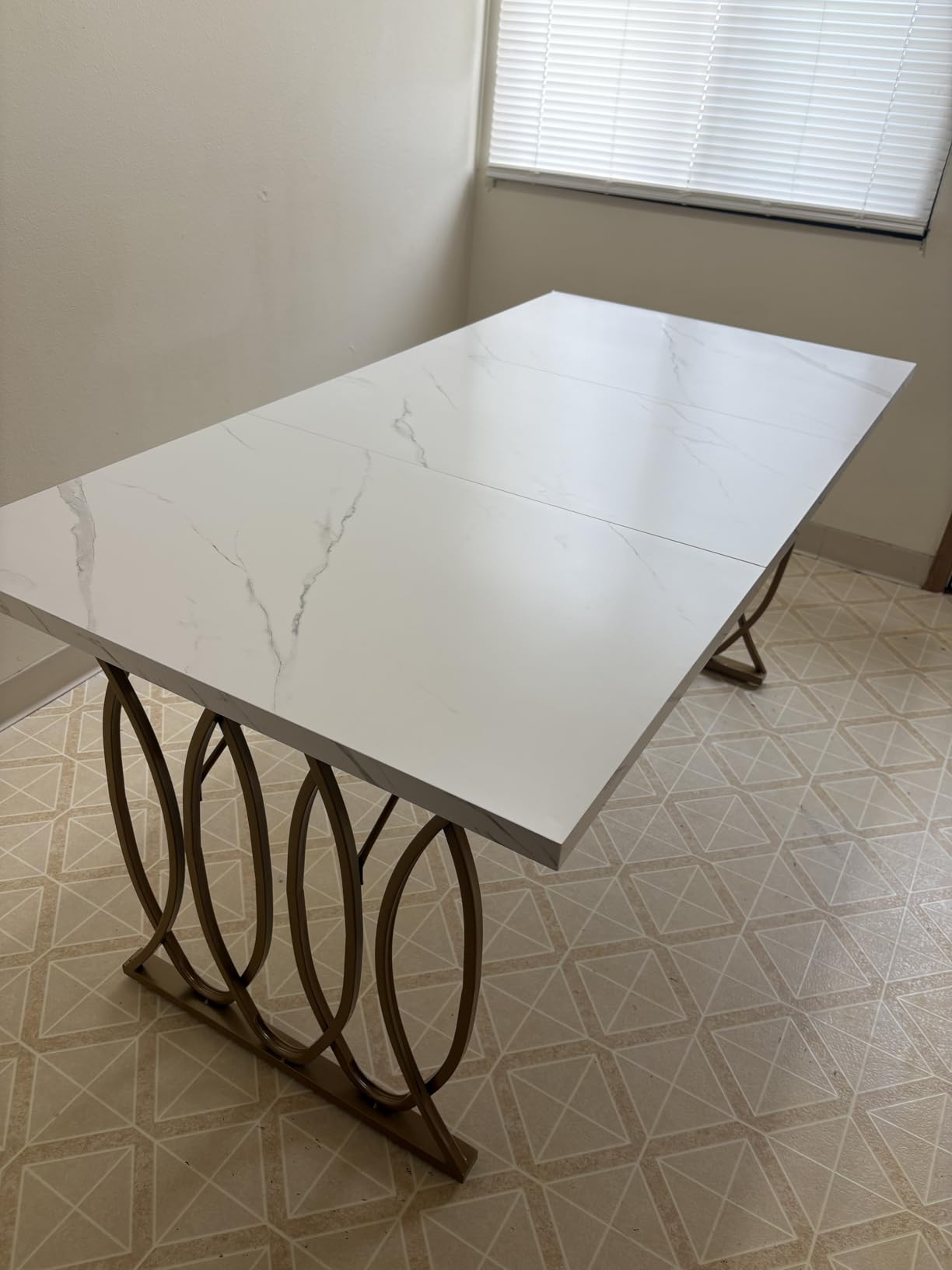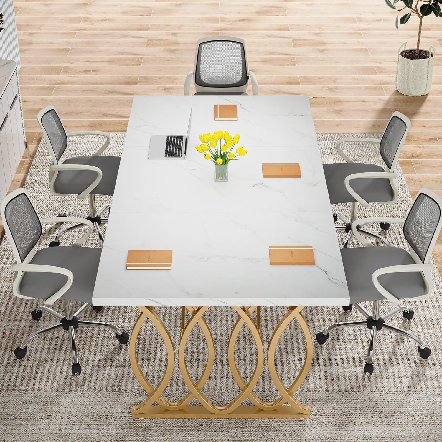 Оваа модерна бело-златна маса совршено се вклопува во секоја канцеларија, домашна работна соба или како конференциска маса. Може да се користи и како маса за пишување, маса за состаноци или дури и како елегантна трпезариска маса.
