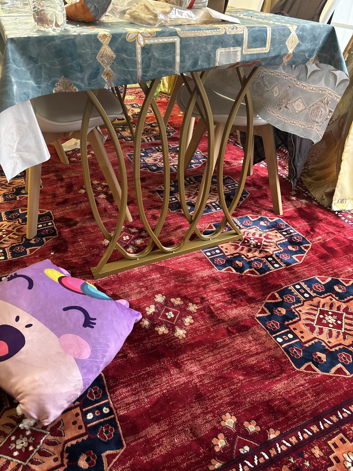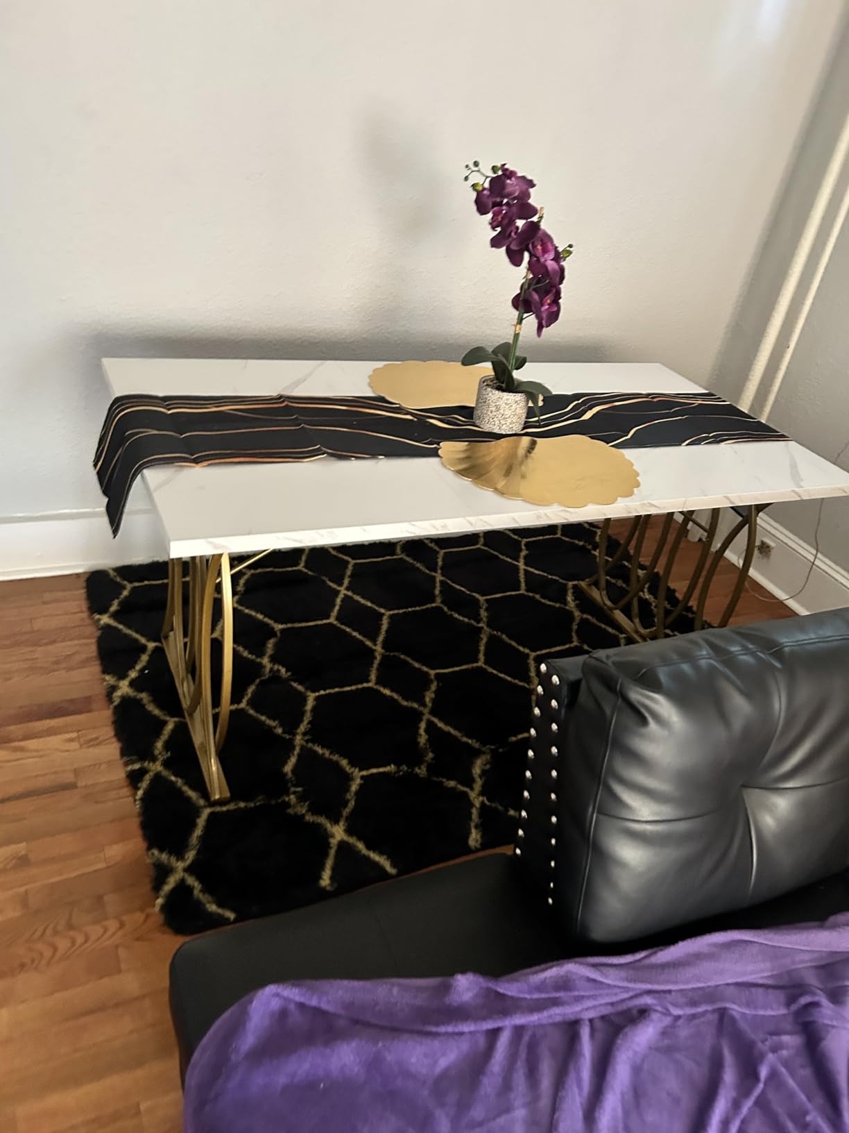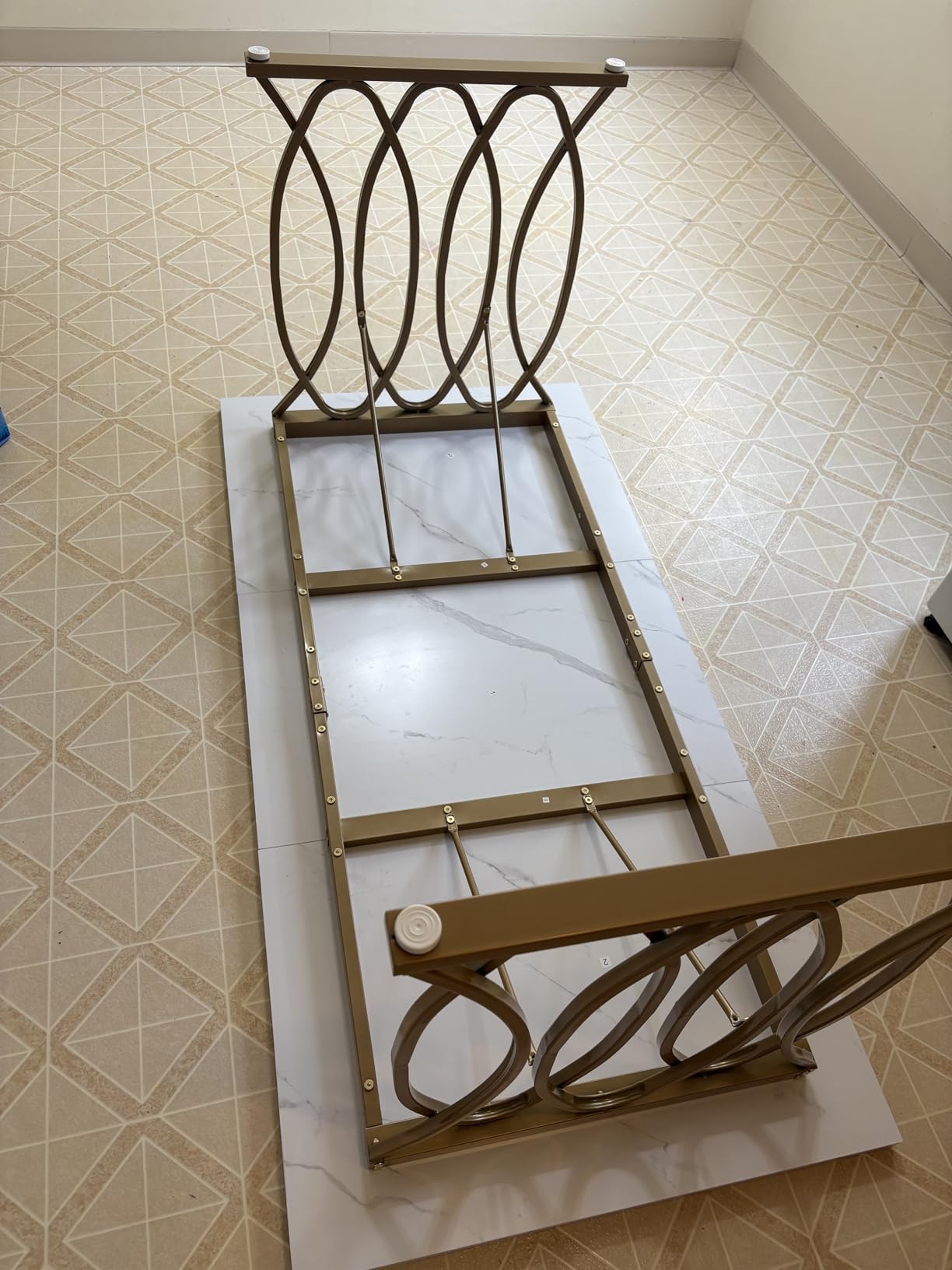 Оваа ексклузивна маса е изработена од висококвалитетна Медијапанска дрвена плоча и златен метален рам. Масивниот метал (3 см) обезбедува исклучителна стабилност, а плочата со дебелина од 3 см е доволно цврста за тешки товари. Прилагодливите ногарки овозможуваат стабилност на нерамни подови и заштита од гребење.
