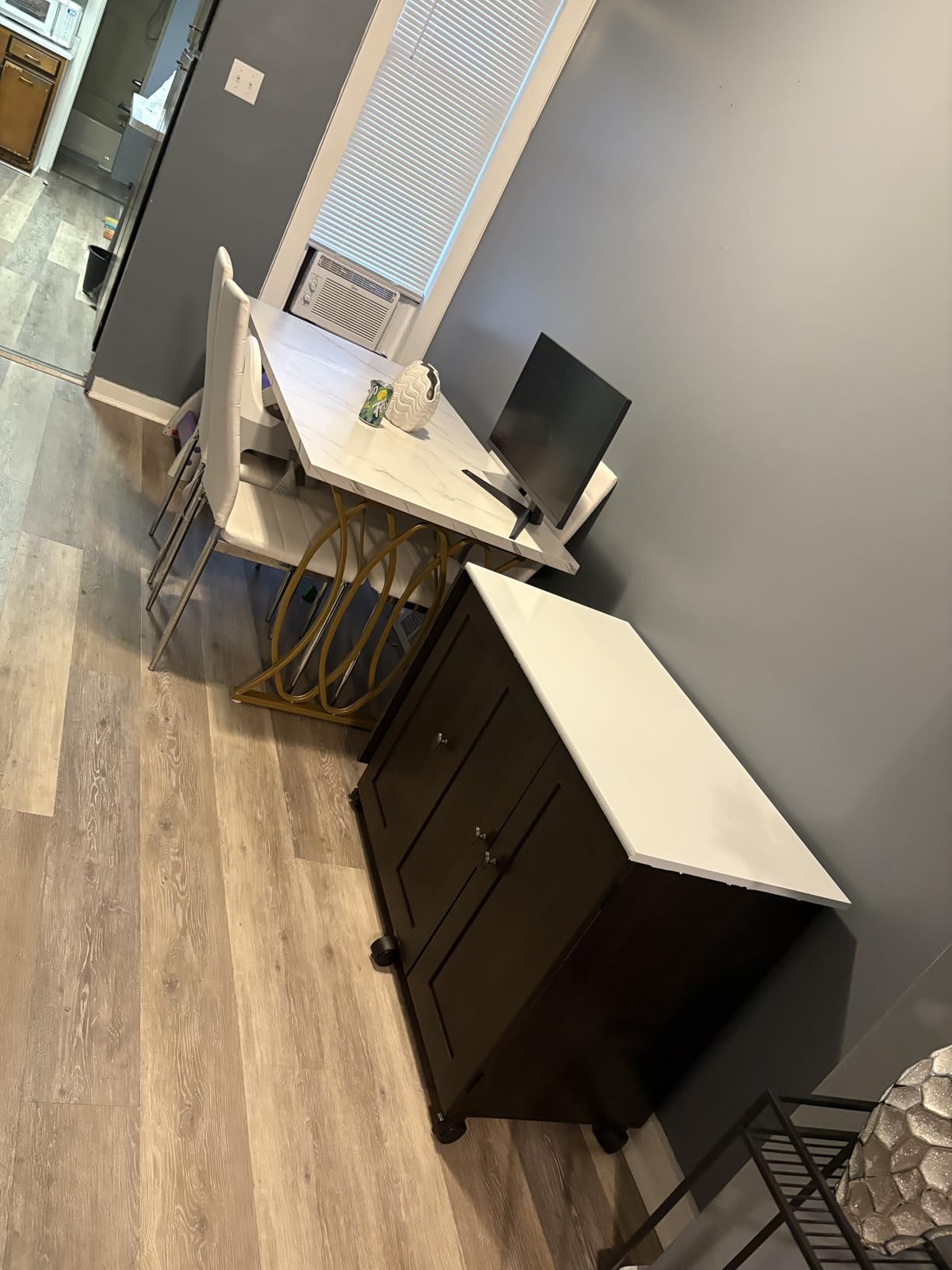 Белата и златната површина со облога на мермер е отпорна на гребење и отпорна на вода, што ја прави практична и лесна за одржување. Совршена е за секојдневна канцелариска употреба без страв од оштетување при пролевање пијалок.