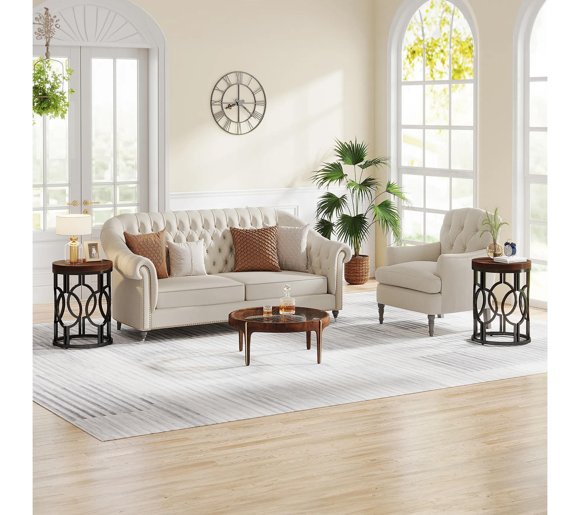 Оваа модерна индустриска масичка е совршен спој на функционалност и стил, дизајнирана да внесе топлина во секој простор. Со својата цврста конструкција и компактни димензии, таа е идеален додаток за дневната соба или спалната соба.