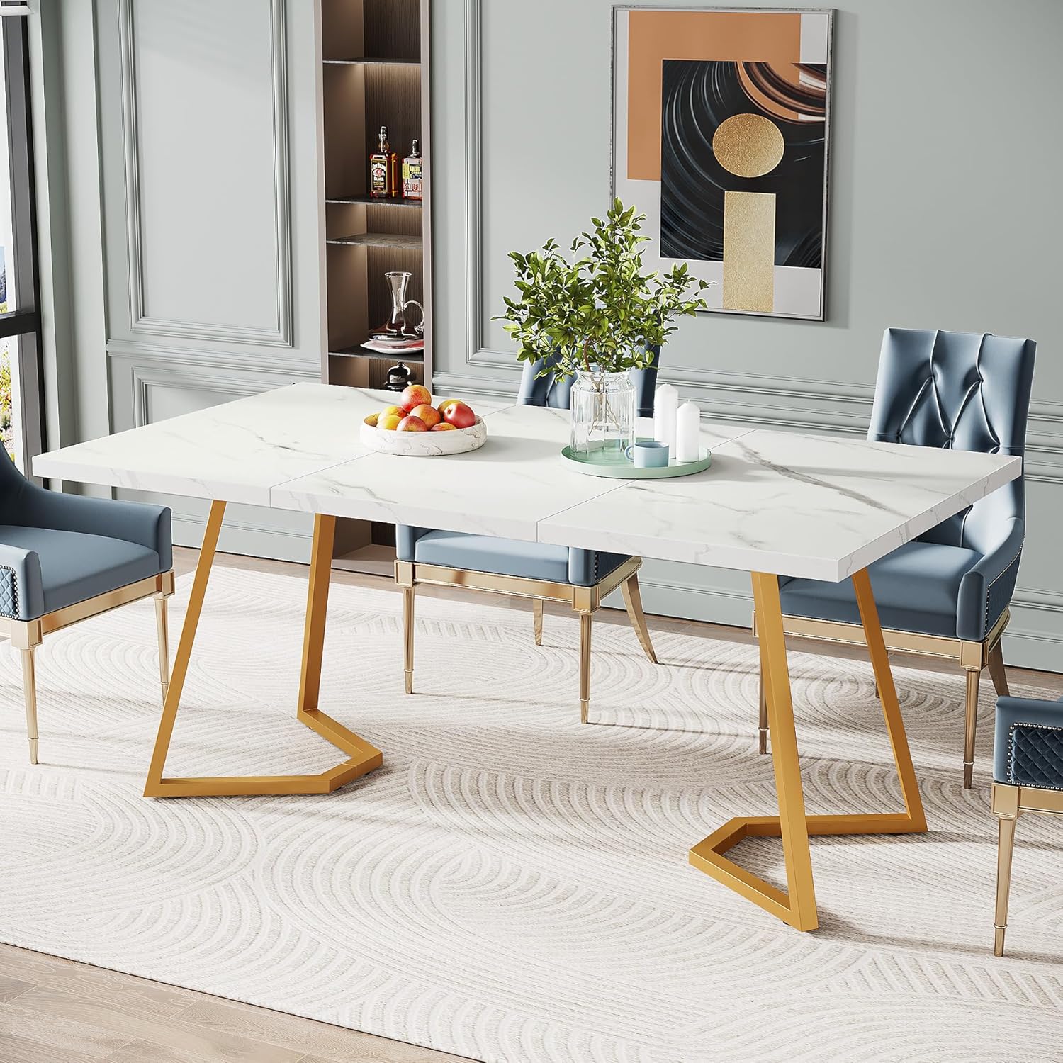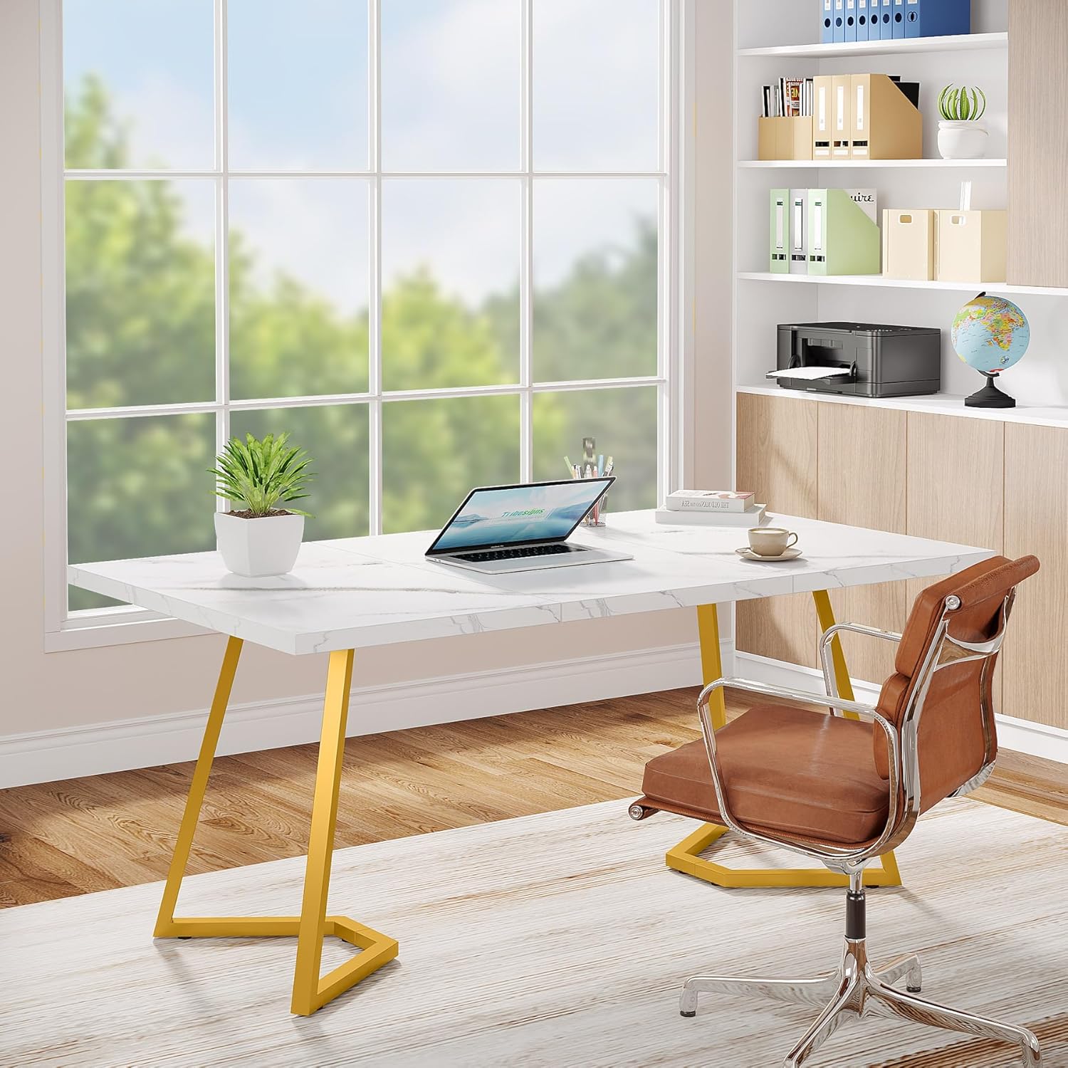 Плени со својот минималистички стил бела faux marble површина комплементирана со златна метална рамка, создавајќи визуелен впечаток што го надминува функционалното и додава софистицирана естетика на секој простор. Овa е идеален избор како за канцеларии, така и за дневни соби или кујни.