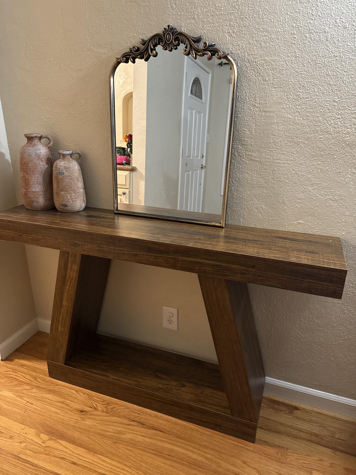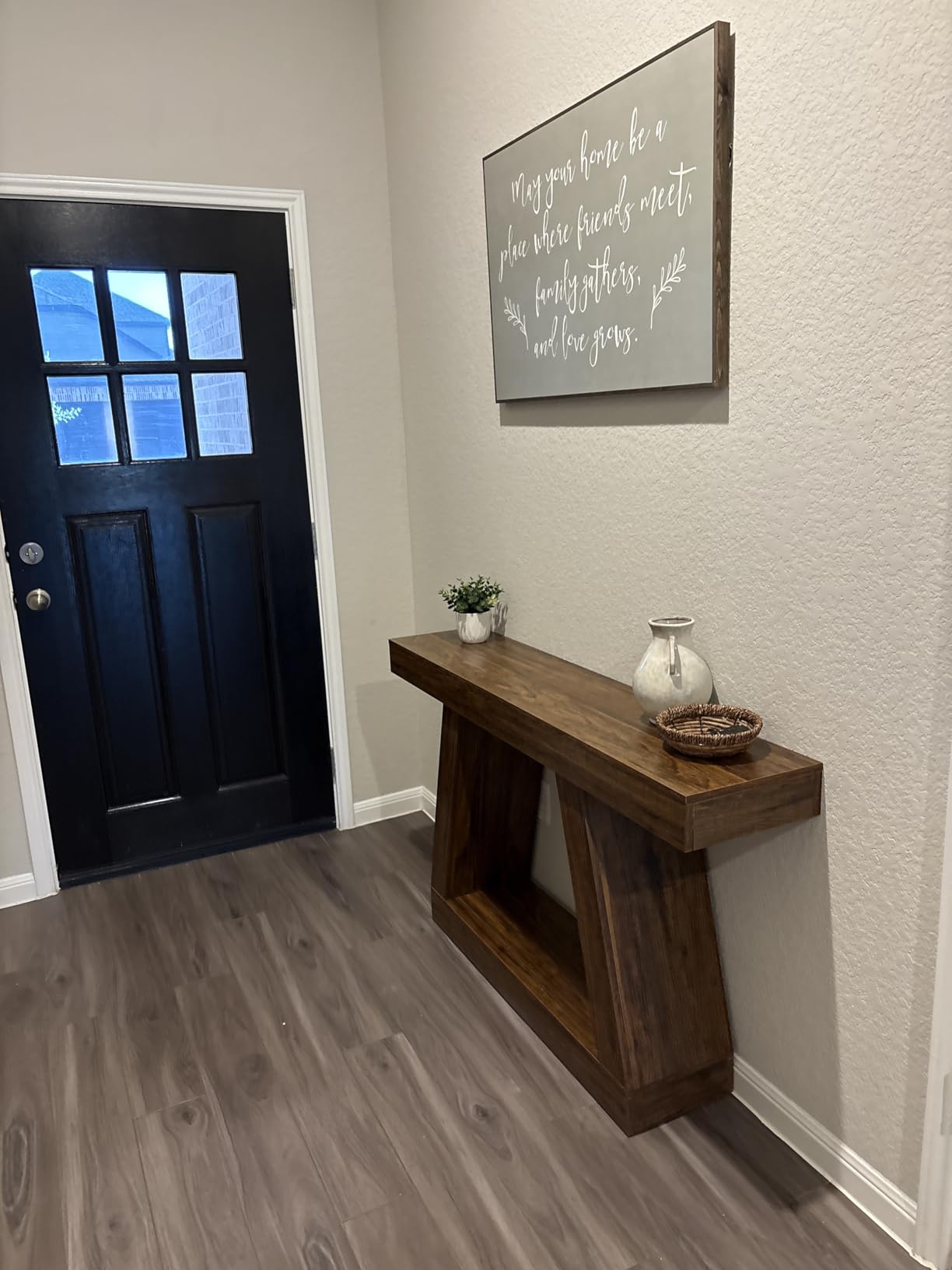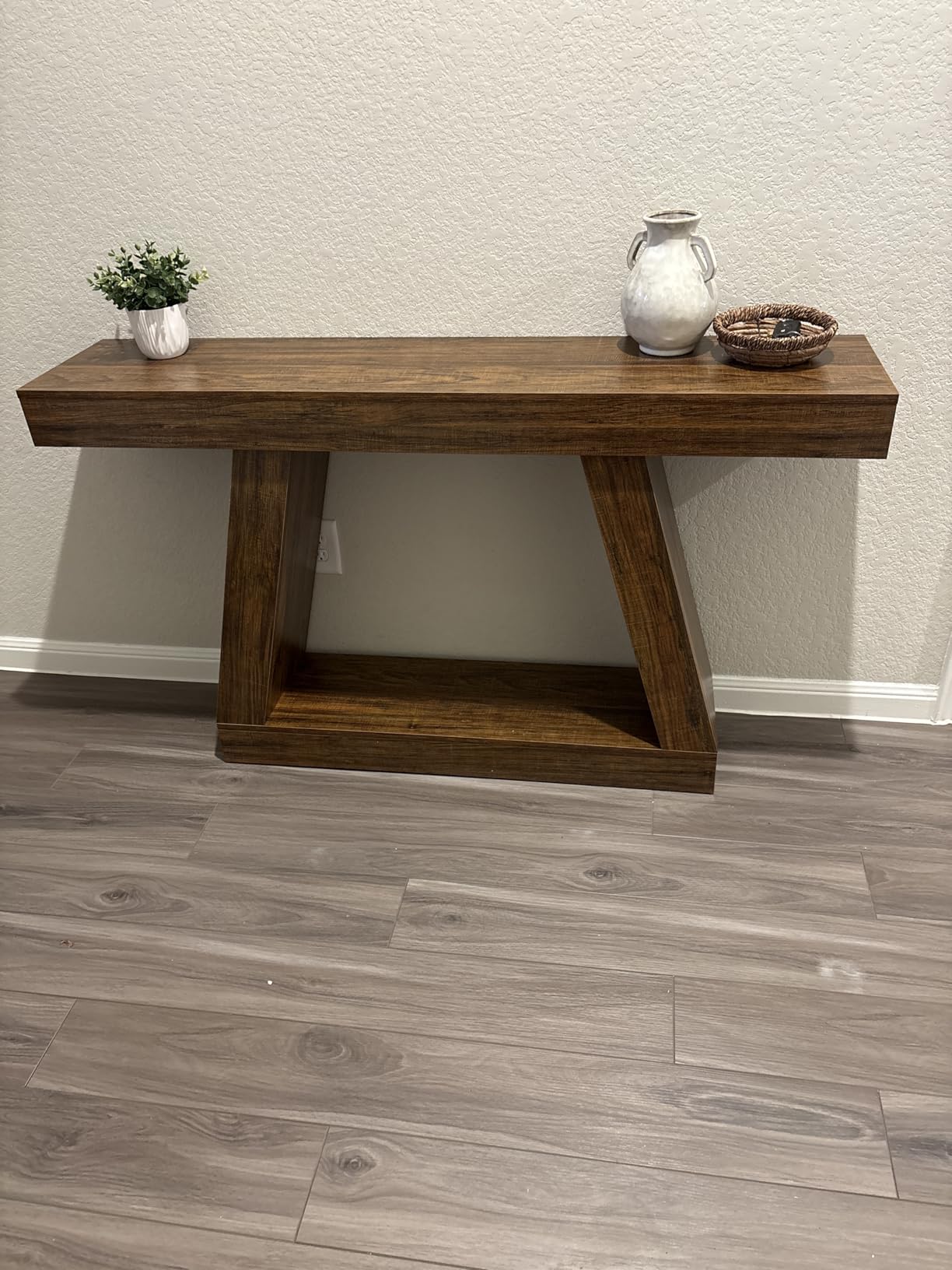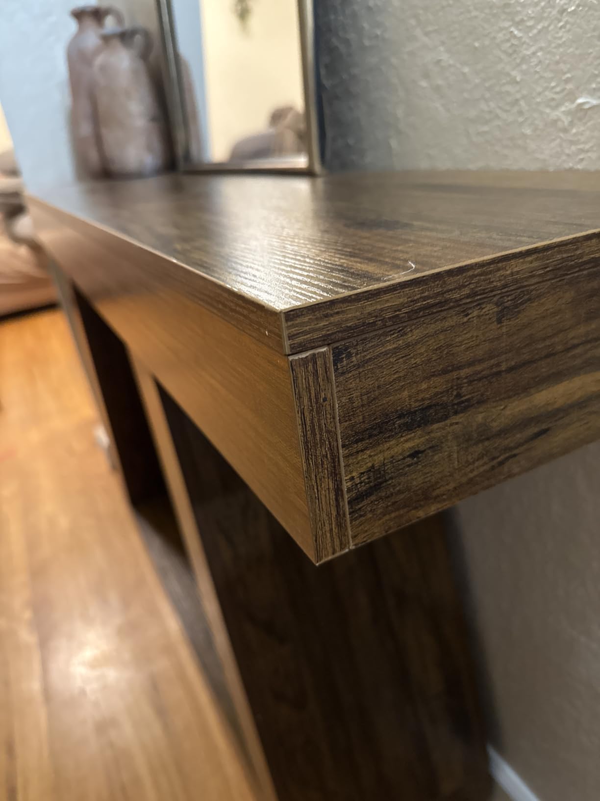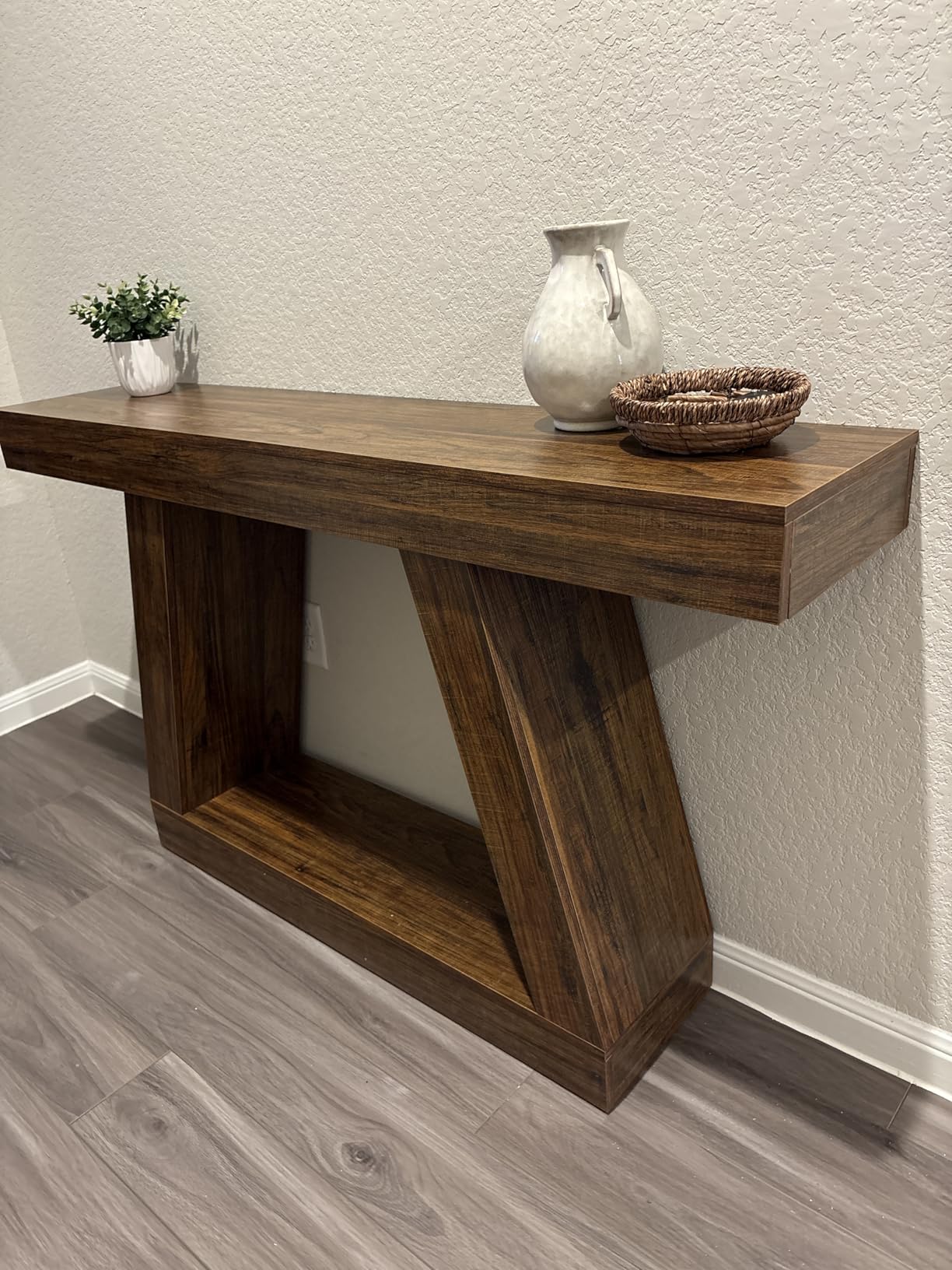 Овој производ беше сè што сакав како влезна маса! Овој производ беше многу цврст, елегантен и отпорен на гребење од преместувањето до најдоброто место што можев да го одберам! Големината беше совршена, ниту мала ниту голема, а бојата едноставно даваше изглед на природно дрво! Неговата функционалност е толку неверојатна за модерен стил на селска куќа!!!! Топло ја препорачувам!!
