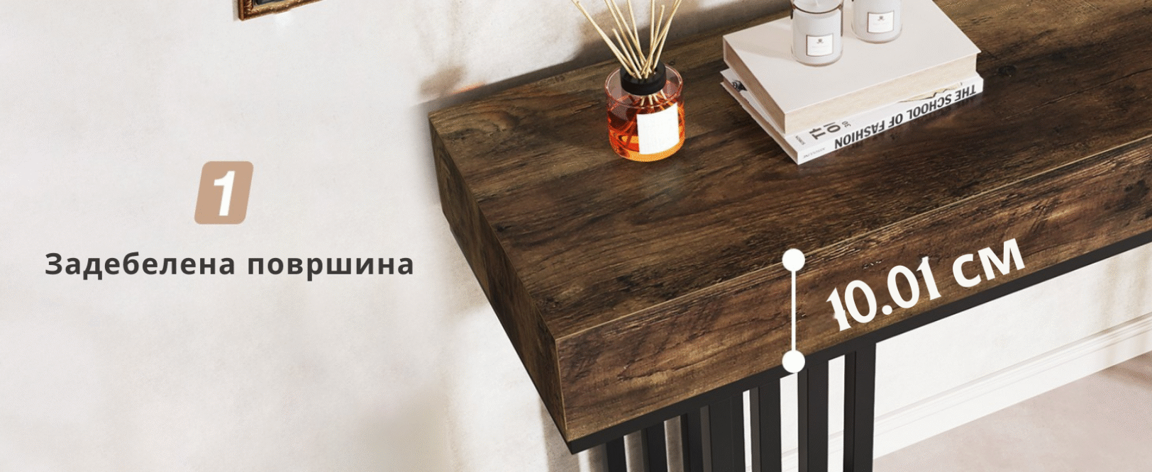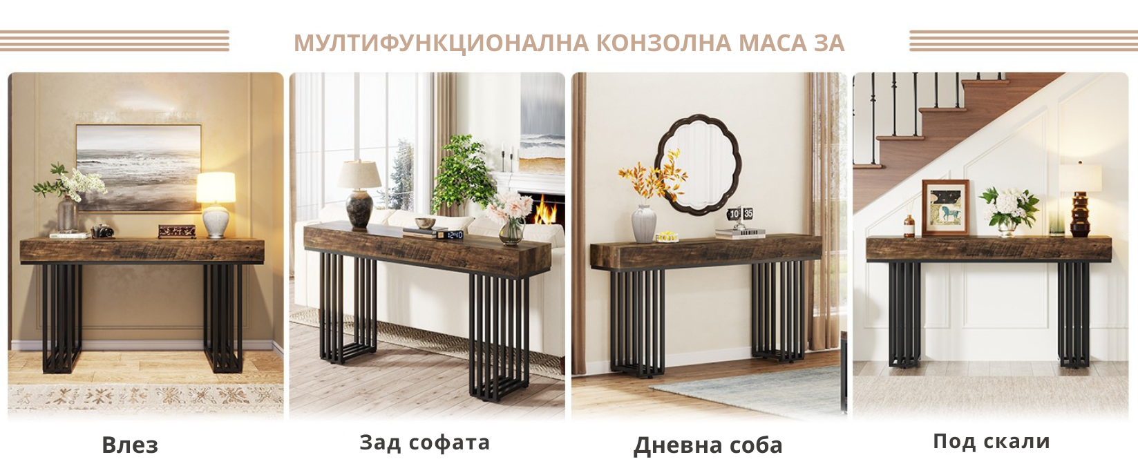 Мултифункционална конзолна маса: Може да се користи за изложување на декорации и фотографии, како маса покрај софа или како странична маса во дневната.