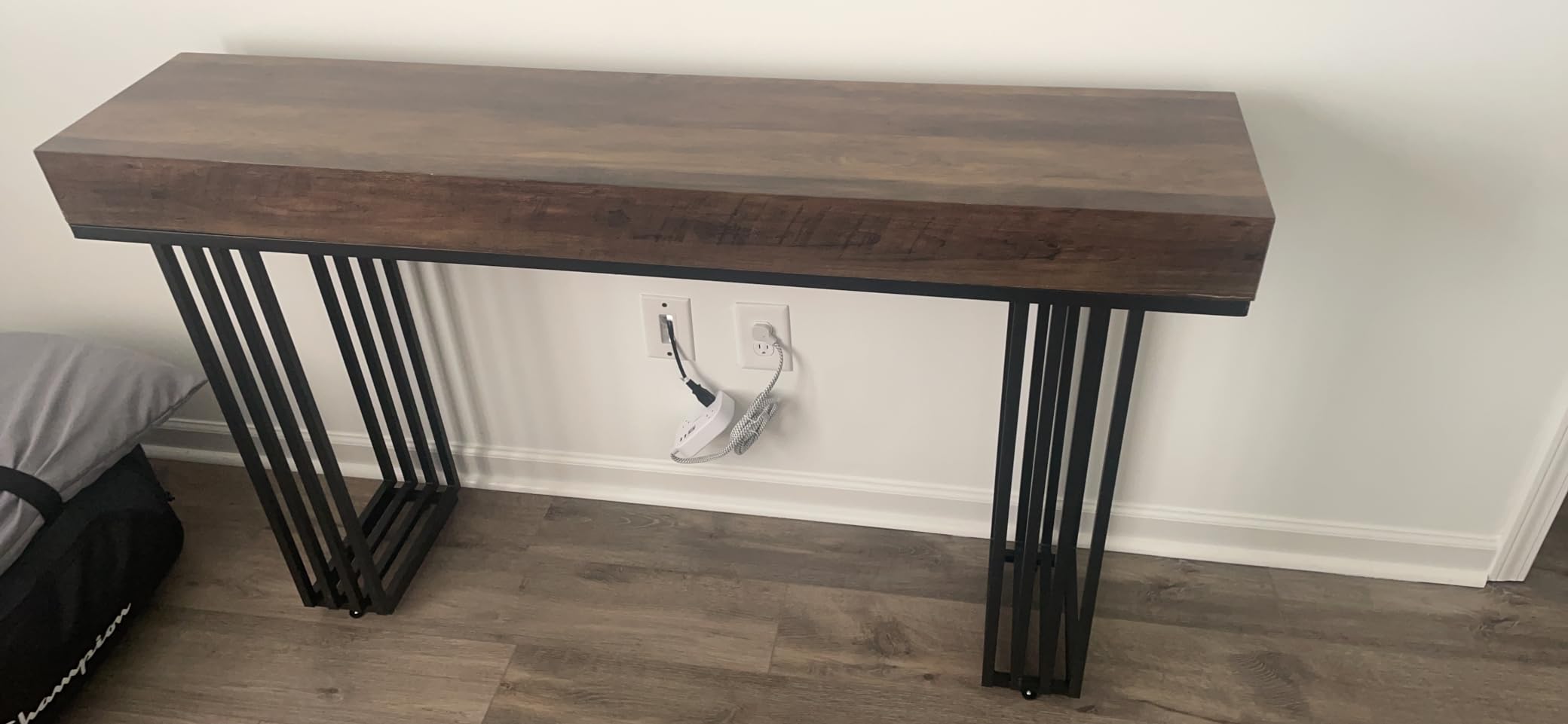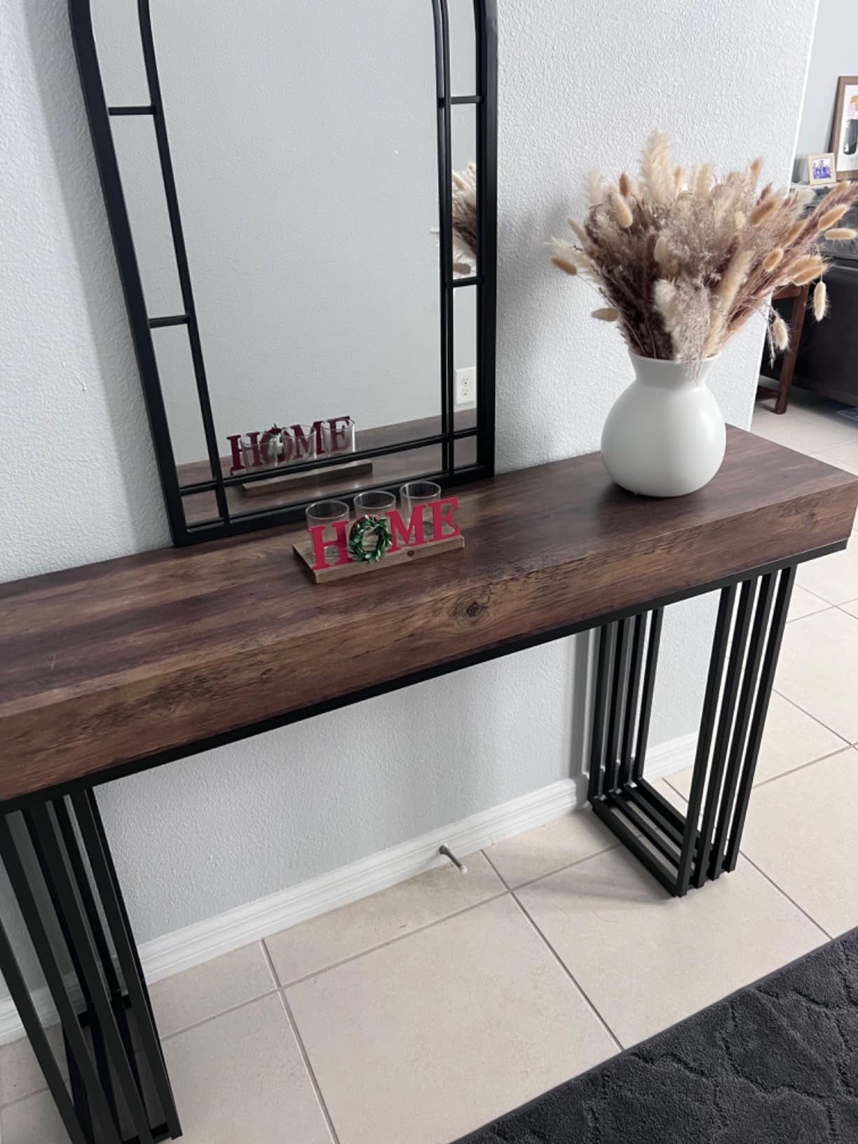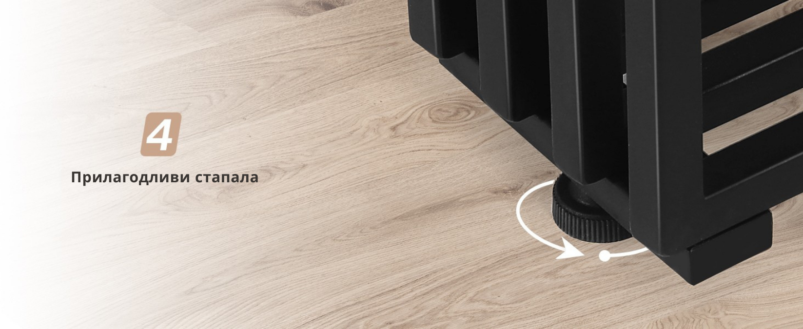 Робустна и стабилна: Со неколку метални ногарки со голема носивост, оваа конзолна маса нуди одлична стабилност и издржливост. Нозете го поддржуваат товарот и додаваат модерен индустриски изглед. Масата има и четири прилагодливи нозе за стабилност на нерамни подови.