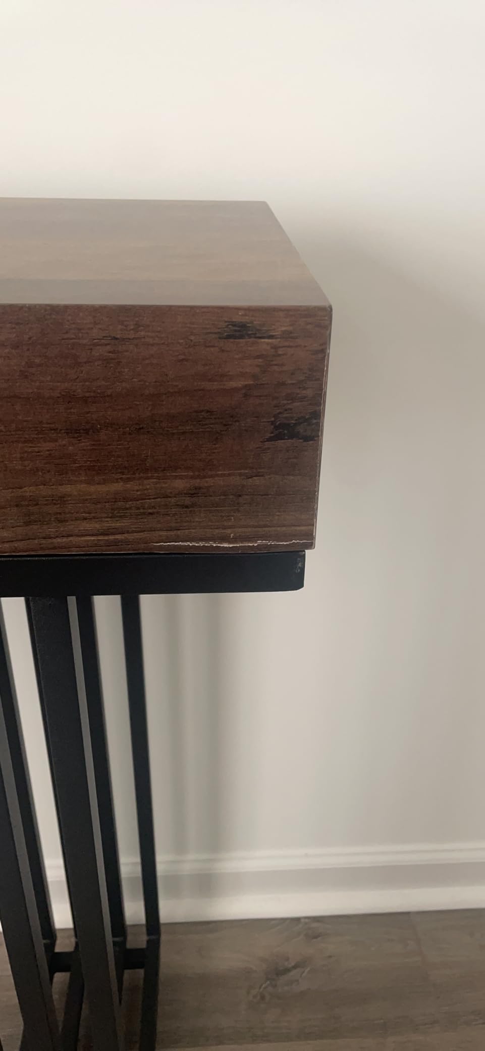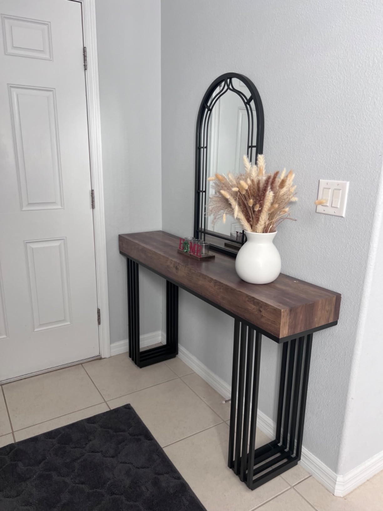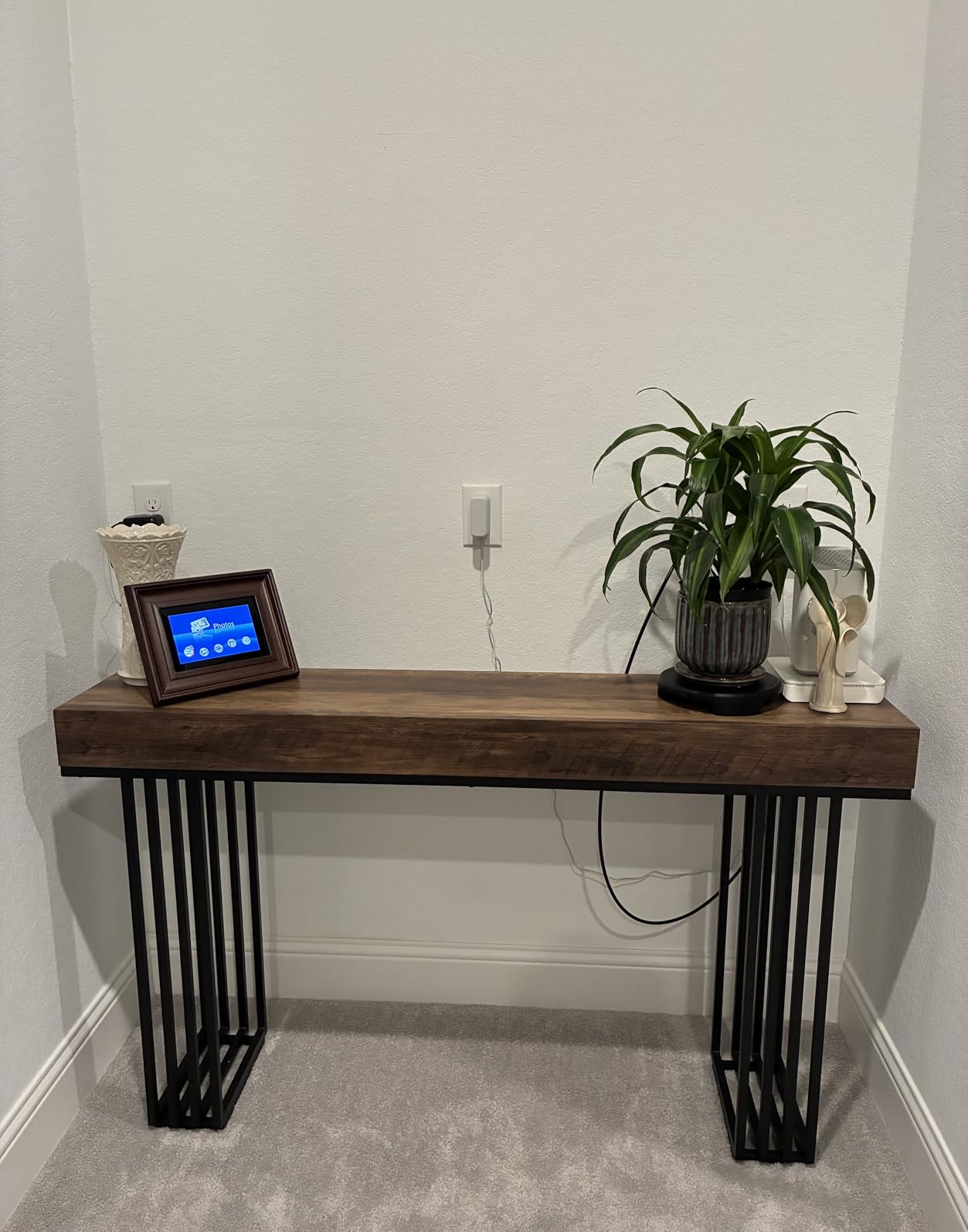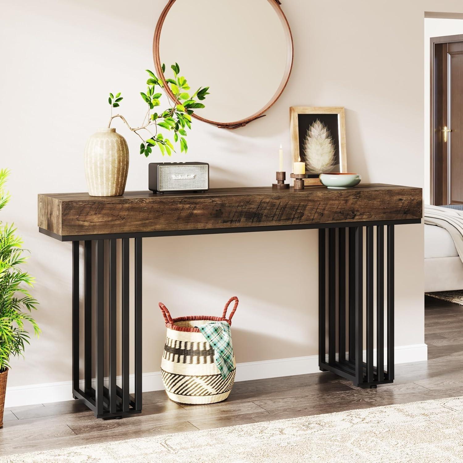 Современ индустриски шарм: Комбинацијата на стилска црна метална рамка со кафеава дрвена плоча се вклопува во различни бои на ентериерот. Додава привлечен допир во вашиот влез или дневна соба.
