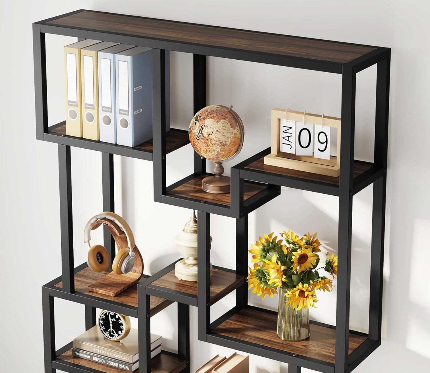 7 практични нивоа: Простор за книги, фотографии, украсни предмети, растенија и колекционерски детали.