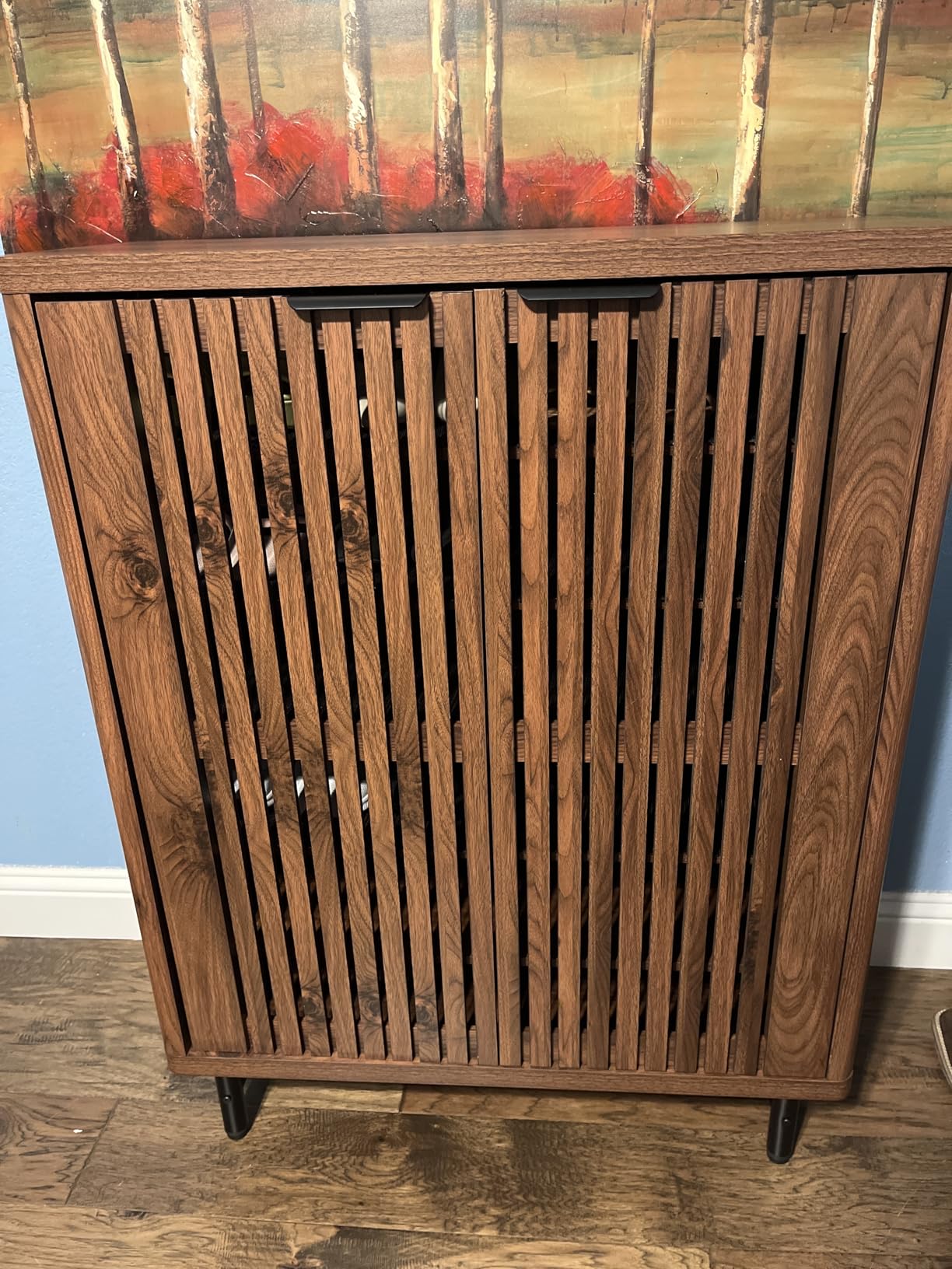 Организирајте ги вашите чевли и додадете стил во вашиот ходник со овој модерен Walnut ормар за чевли. Со 6 полици и проветрени врати, вашиот простор ќе биде уреден, а чевлите заштитени.