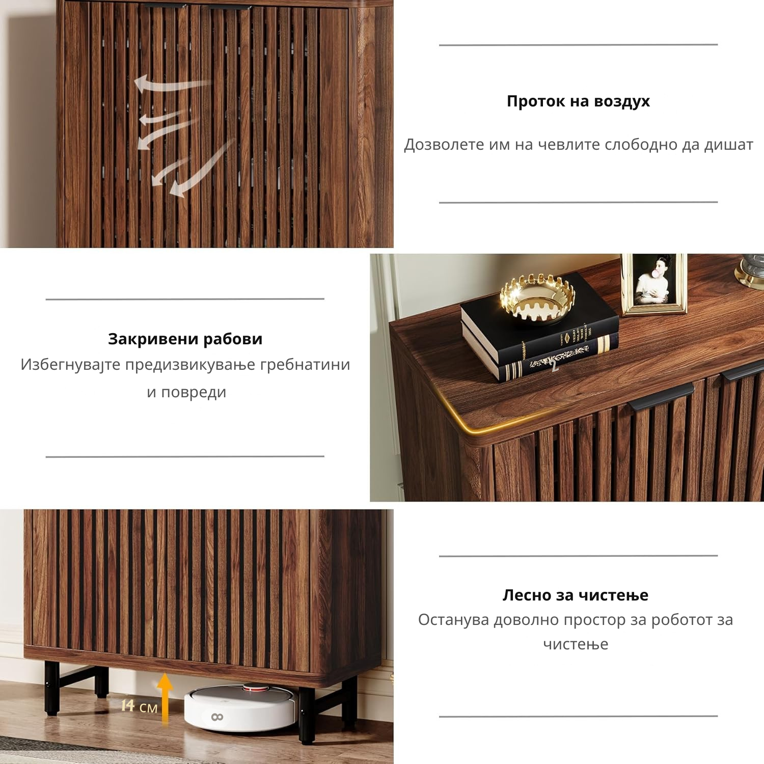 Мултифункционална површина: Горниот дел е идеален за клучеви, чанти и секојдневни предмети, а долната отворена полица за домашни чевли или роботски правосмукалки.